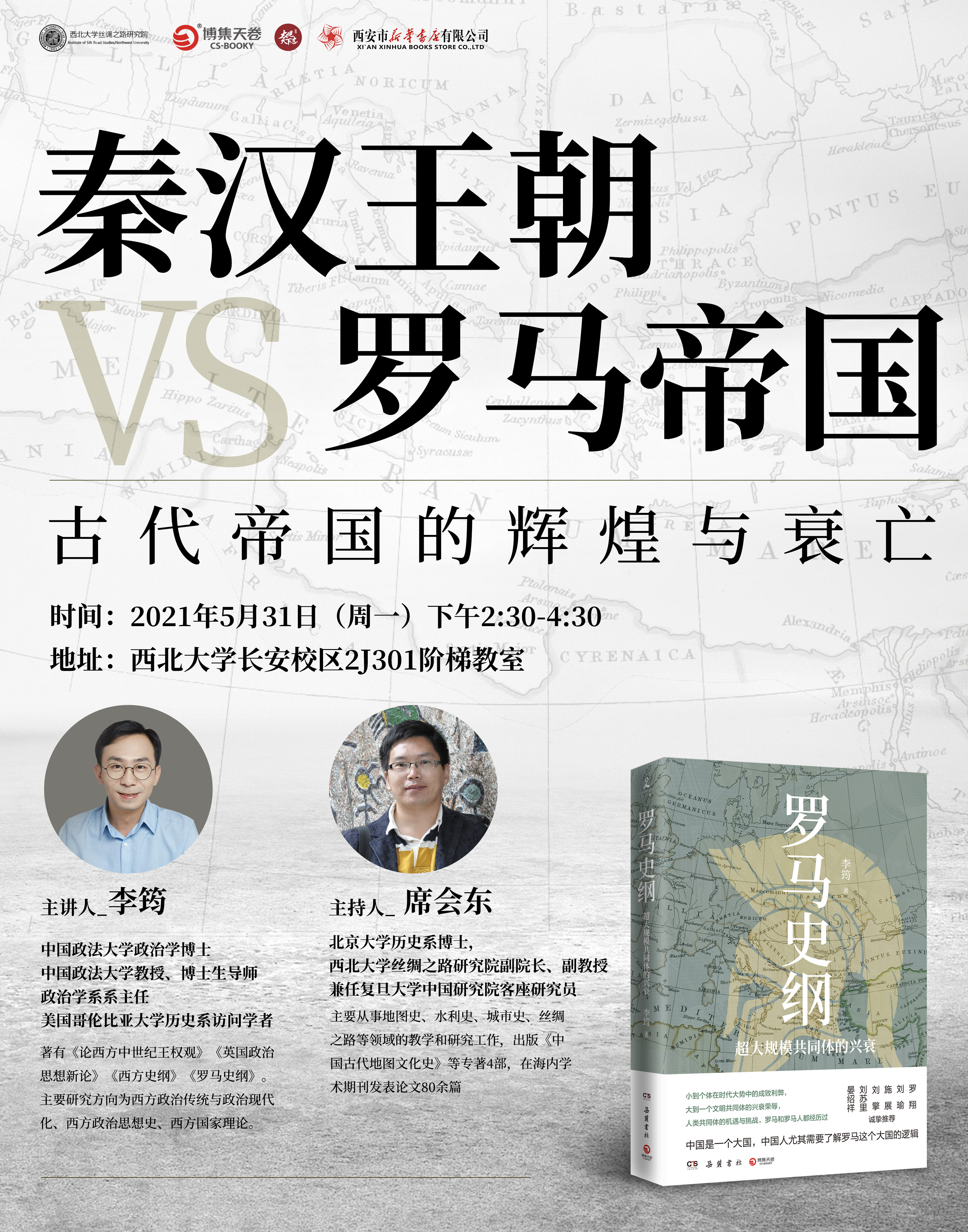 讲座预告:秦汉王朝VS罗马帝国:古代帝国的辉煌与衰亡 作者: 编辑:叶苗 时间:2021-05-30 时间:2021年5月31号(周一)下午2:30-4:30 地点:火狐官方网页版长安校区2J301 主讲人:李筠 中国政法大学教授 主持人:席会东 火狐官方网页版丝绸之路研究院副教授