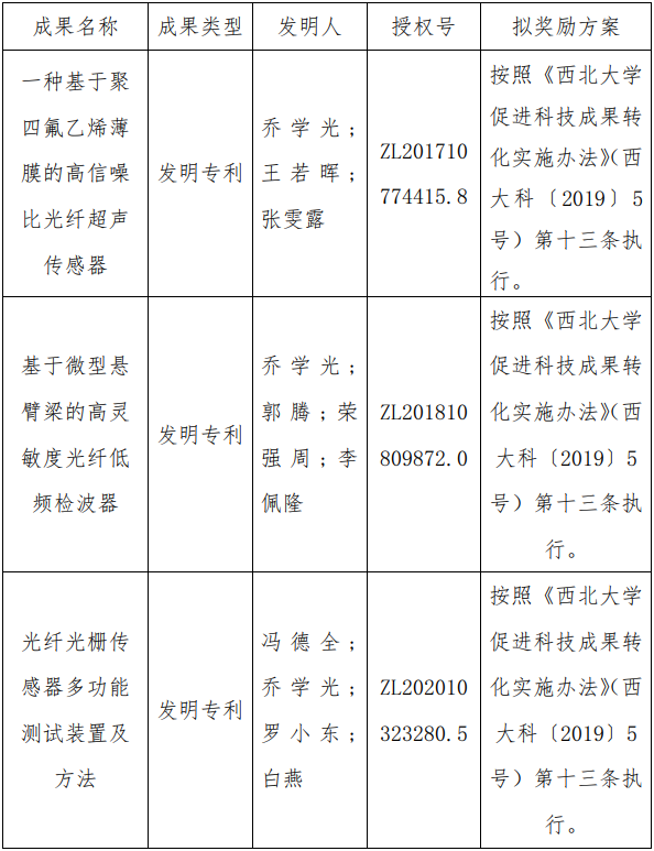 按照《火狐官方网页版促进科技成果转化实施办法》(西大科〔2019〕5号)相关规定,拟对火狐(中国)物理学院乔学光教授作为成果负责人的3项发明专利权实施普通许可,现将相关信息公示如下: