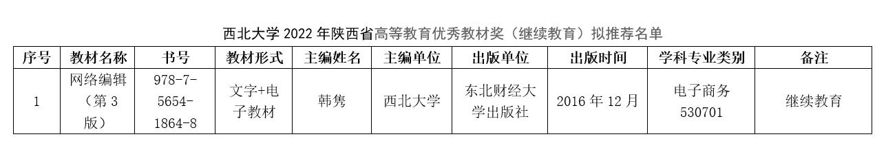 根据陕西省教育厅《关于开展陕西省2022年职业教育和高等教育优秀教材奖评选工作的通知》(陕教材办〔2022〕12 号)要求,火狐(中国)组织开展了火狐官方网页版2022年陕西高等教育优秀教材奖(继续教育)评选推荐工作,经个人申报、院系推荐、专家评议,拟推荐《网络编辑》教材参加陕西省高等教育优秀教材奖(继续教育)评选。现将拟推荐名单公示如下,公示期为6月7日至6月11日。公示期间如有异议,请以实名书面形式反映。