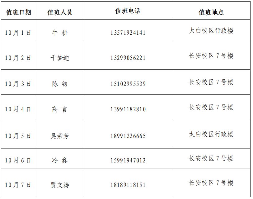 实验室建设与管理处2022年国庆节值班安排