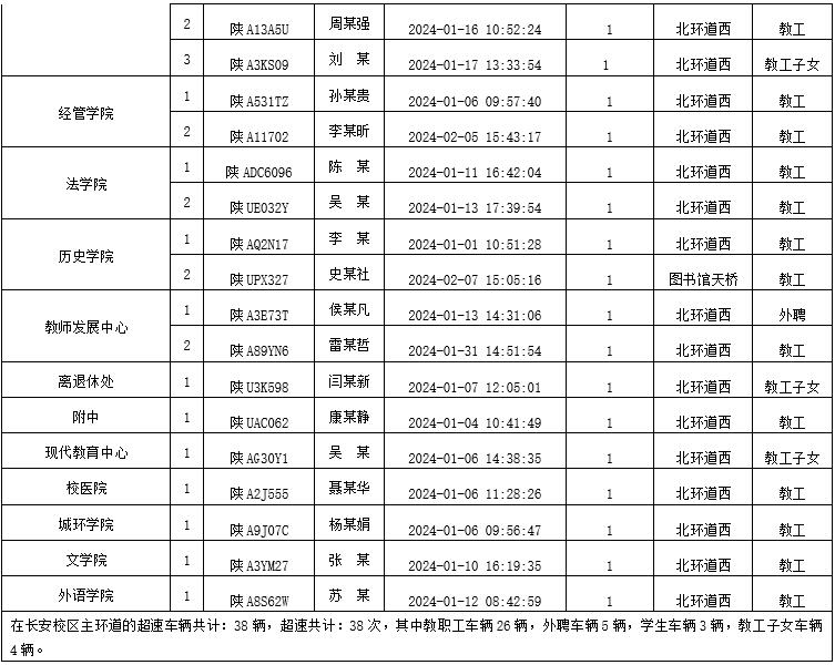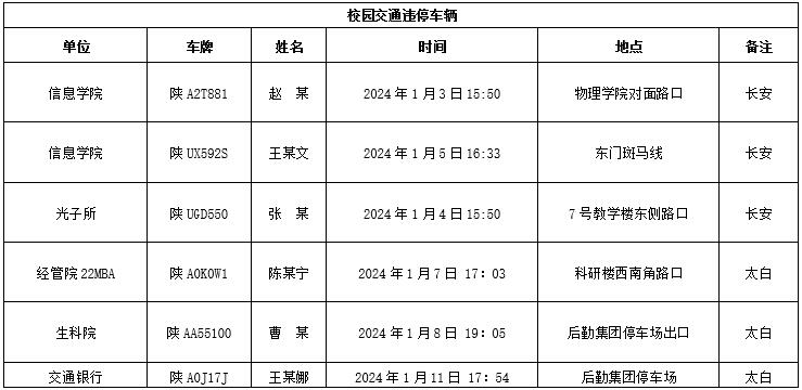 为加强校内道路交通安全管理,规范校内交通秩序,根据《火狐官方网页版校园道路交通管理办法》有关要求,现将2024年1月校园交通违章车辆予以曝光,所在单位负责对本单位违章师生员工进行交通安全教育和日常管理。